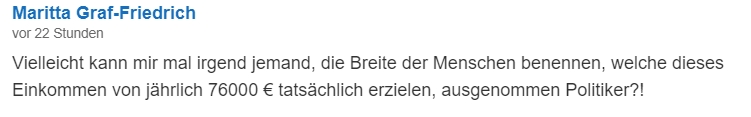“或者谁能告诉我,除了政治家之外,实际上有多少人能够达到每年76,000欧元的收入水平呢?”