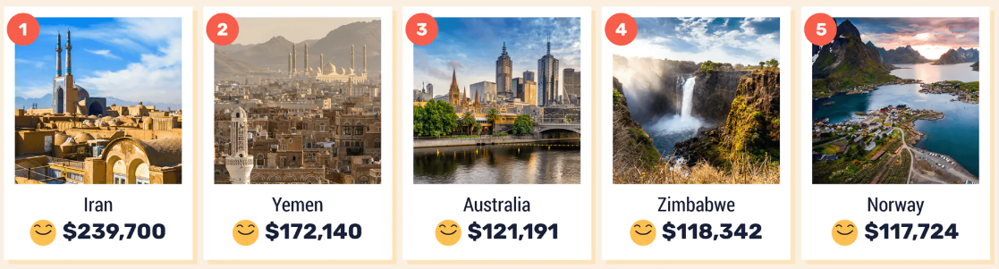 比如在伊朗,大量的人口生活在贫困线以下,甚至有相当比例的人口每天生活费用低于5.5美元。再加上高达47.7%的通货膨胀率,日常用品的价格飙升等等因素,这说明“幸福收入”排名靠前可能更多是由于经济的挑战。这并不代表着这些国家有着更高的生活满足度,而是反映了为了达到基本的生活标准需要付出更多的努力。