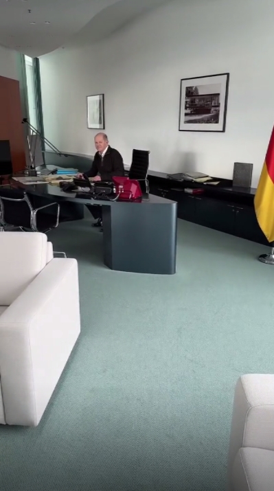 伴随着悬疑的bgm,白色运动鞋踩在鸽灰色的地毯上。最后,脚步在一个黑色公文包前停了下来,公文包上有两个银色的扣子。这个包大家都晓得吧——它是总理忠实的伙伴。的确,一个突然的镜头左转: 奥拉夫·朔尔茨正坐在联邦总理府的办公桌前上演经典“德国瞅”,旁边是一面德国国旗和一部红色电话。