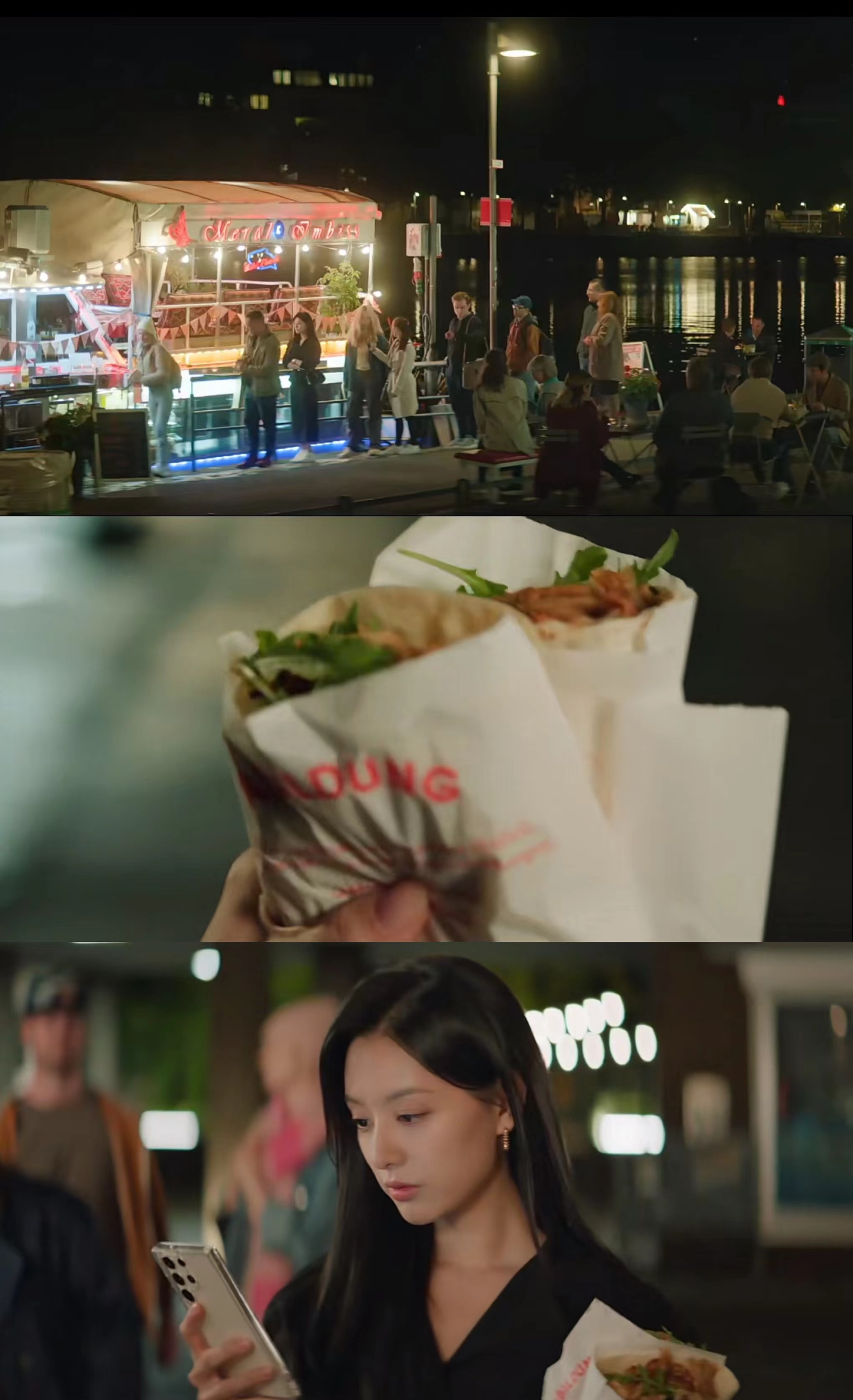 剧里女主还排队买了德国到处可见的土耳其烤肉卷饼(Döner),剧中的摊位名叫做Meral Imbiss,在美茵河畔桥头河边的船上。剧中排在女主前的一位游客要把最后五个全部买走,于是女主以自己活不了多久为理由卖惨获得了大家的同情买到了卷饼。