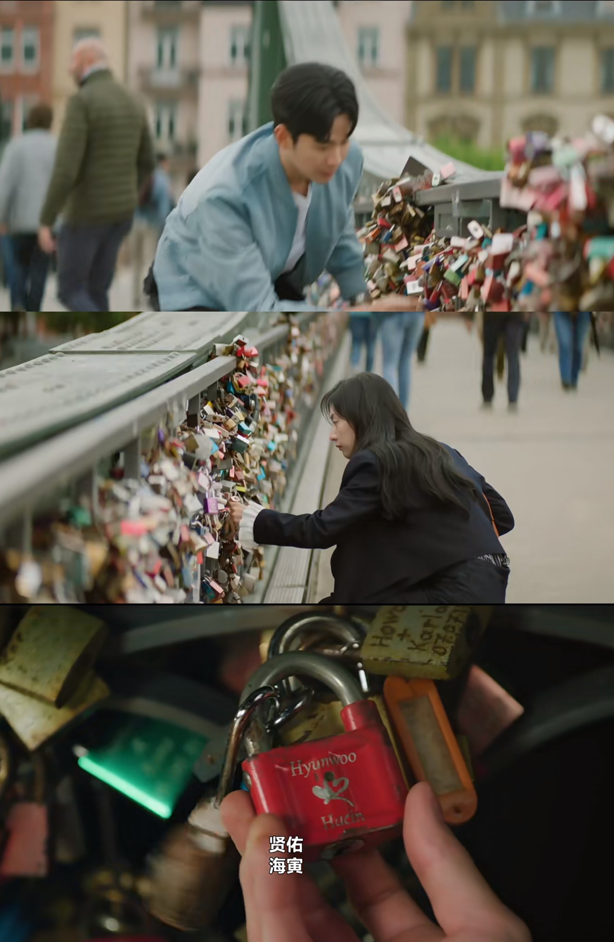 男女主寻找三年前挂上的同心锁没有成功,直到晚上白贤祐为女主买下小摊上所有四叶草后,在桥上终于找到。这里金秀贤也贡献了让很多观众心动的“天桥跑”名场面。
