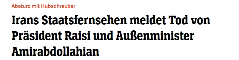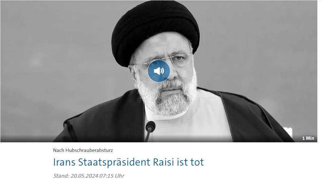 Mehrere iranische Medien haben am Morgen berichtet, dass Irans Präsident Ebrahim Raisi sowie der Außenminister Hossein Amir-Abdollahian bei dem Absturz ihres Hubschraubers im Nordwesten des Landes ums Leben gekommen seien. Raisi hätte einen Unfall gehabt, "als er dem iranischen Volk diente und seine Pflicht erfüllte und ist den Märtyrertod gestorben", berichtete etwa die Nachrichtenagentur Mehr.