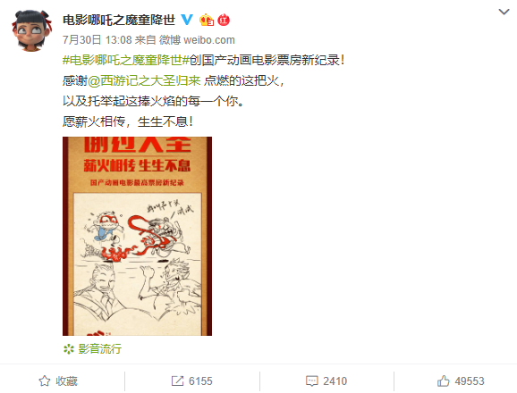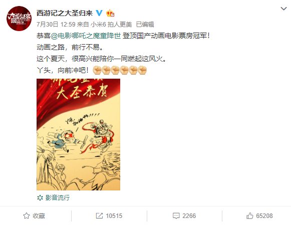 大圣官方也发出祝贺,自此,由《大圣归来》点燃的这把国漫之火,经由《大鱼海棠》、《大护法》、《风语咒 》、《白蛇缘起》等佳作,传承到《哪吒之魔童降世》手上,燎燎火焰,越烧越旺。