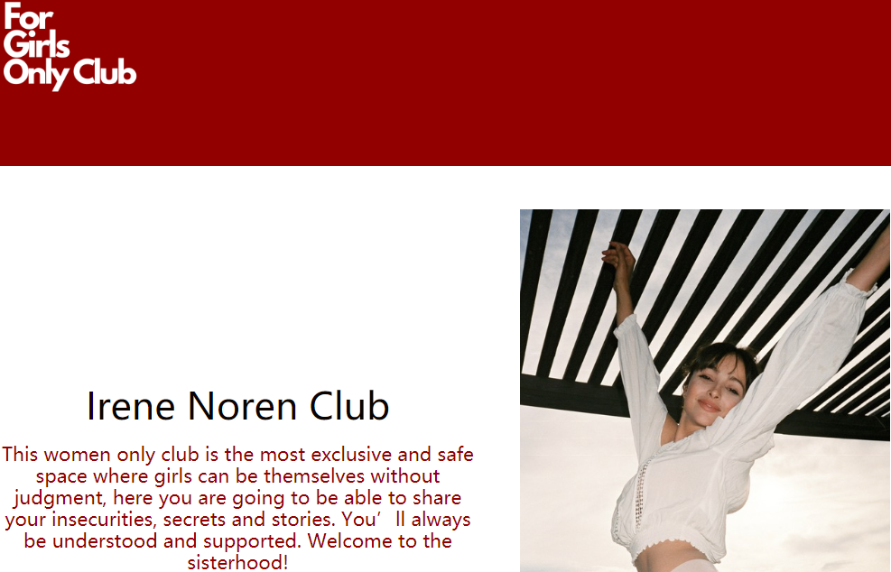如今的Irene早已经不再在意“angel face with sad eyes”的评价,她只想继续过好自己的人生。除了ins博主和模特的工作,Irene也尝试创立了自己的品牌,并建立了一个名为“For Girls Only Club”的女性俱乐部,那里是一个专属于女孩子的最独特,安全的空间,可以在其中分享自己的秘密或故事。