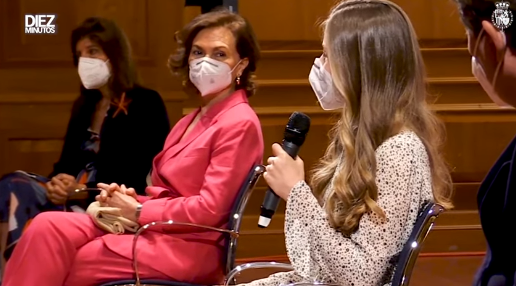 在塞万提斯学院秘书长、负责指导并在活动期间解释学院技术改造项目的卡门·纳格罗(Carmen Noguero)发言后,公主手持麦克风,在观众席中发言。首先,她祝贺塞万提斯学院成立30周年。作为ESO(Educación Secundaria Obligatoria,西班牙的中学教育)的学生,莱昂诺尔经常使用该学院的虚拟塞万提斯图书馆。其次,她询问了学院在西班牙境外的工作人员的情况,他们自疫情开始,一直未能返回西班牙与家人见面。