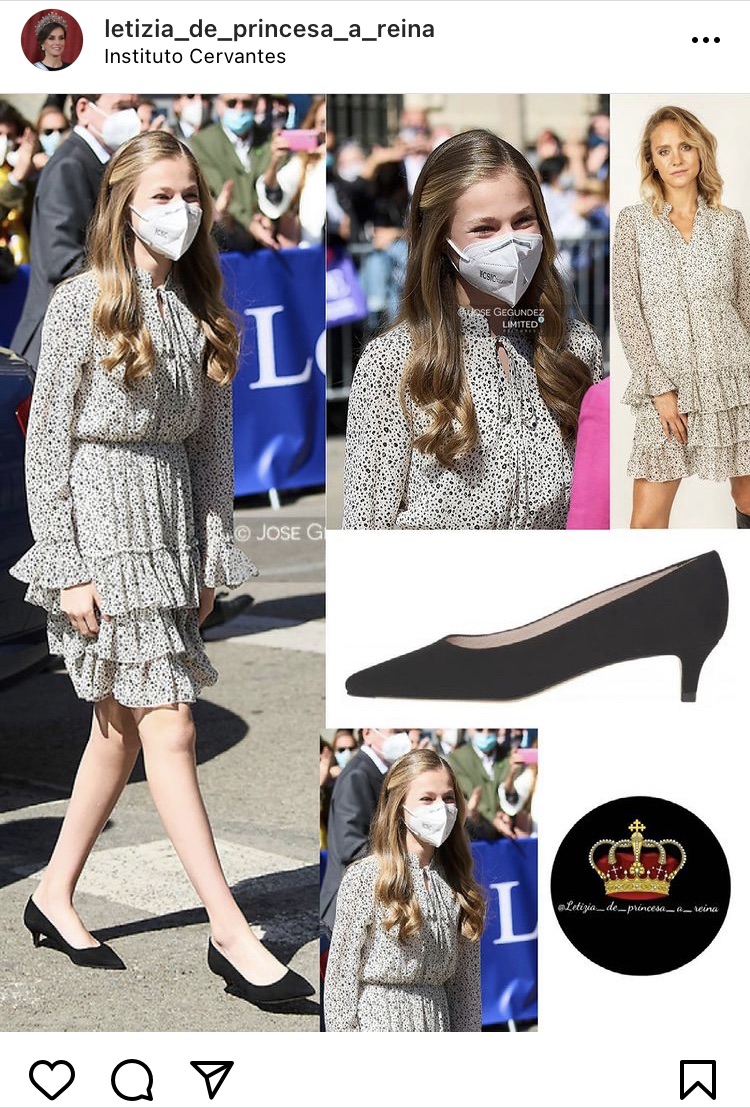 在2020年阿斯图里亚斯王子奖获奖者的见面会上,她也穿着同样的礼服。如今她又穿着这套衣服来到塞万提斯学院,再次突出了她这段时间以来的个人风格,引领着西班牙的时尚潮流。这条碎花雪纺连衣裙来自Poète。