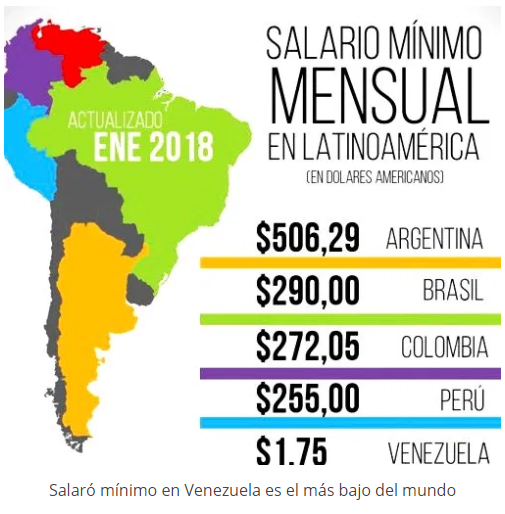 委内瑞拉的最低工资数值真的是异常的低:2.4 美元。工资是如此之低,甚至都不能满足最低的生活标准。根据劳动者数据研究中心(CENDA)的调查结果显示,在委内瑞拉只有小于1%的人能够糊口。然而,这一数额却是计算300万公务员和450万养老金领取者(总共占老年人口的三分之一),以及一部分私人就业者所获得的报酬的基础。此外,根据工龄和专业化程度来计算最终工资的乘数也很低,因此,一个拥有博士学位和20年工龄的公务员,每月的工资不会超过35美元。