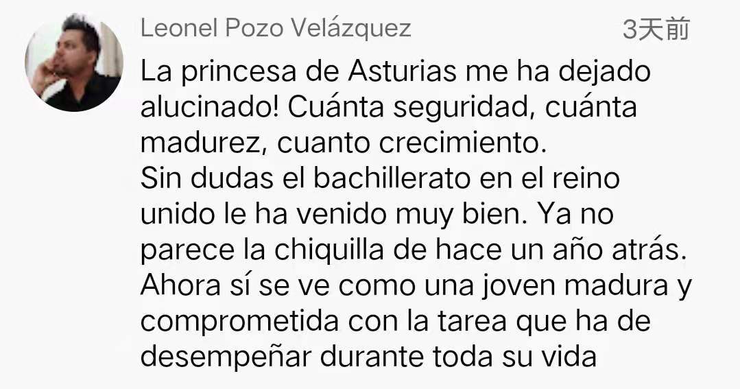 “阿斯图里亚斯公主太让我着迷了!她变得多么坚定、成熟,真的是长大了。她在英国的高中生活一定非常顺利。她不像是一年前那个小女孩了,现在她看起来是一个成熟的年轻人,并且有决心承担她的终生使命。”