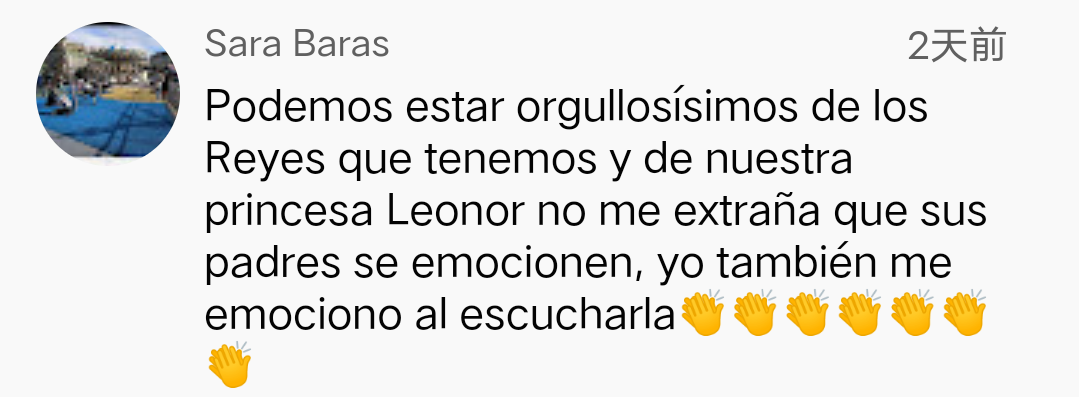 “为我们的国王、王后和莱昂诺尔公主感到骄傲。我毫不意外地看到公主的父母如此感动,我听到她的演讲也觉得很激动。(鼓掌!)”