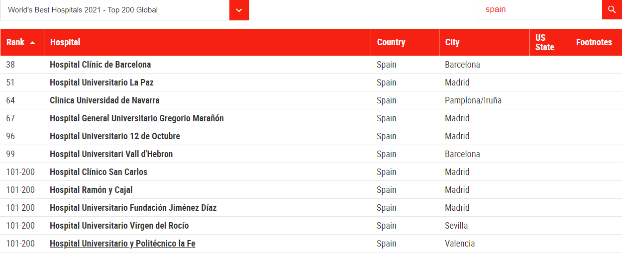 Estos hospitales de la lista son La Paz, Gregorio Marañón, Clínico San Carlos, 12 de Octubre, Ramón y Cajal, Niño Jesús, La Princesa e Infanta Leonor. La Paz y Gregorio Marañón son los que logran un puesto en todas las especialidades como cardiología, cirugía cardíaca, endocrinología, aparato digestivo, neurocirugía u oncología entre otras.