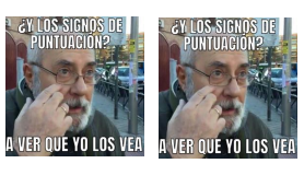 除了这些有名的表情包以外,Noemí还会用大家熟悉的表情包图片来制作适合自己课程的版本。有一张上面是一只手在两个按钮之间犹豫不决,一个是b,另一个是v(旨在提醒同学要分清楚这两个字母);另一张是蝙蝠侠一边抽一个恶棍,一边说:“系动词…后面不加直接补语(complemento directo)!”;还有一张图上,原本是有一位先生质疑气候变化的存在并要求看到污染才能相信,但现在他却说:“标点符号呢?让我们看看我是否能看到他们。”