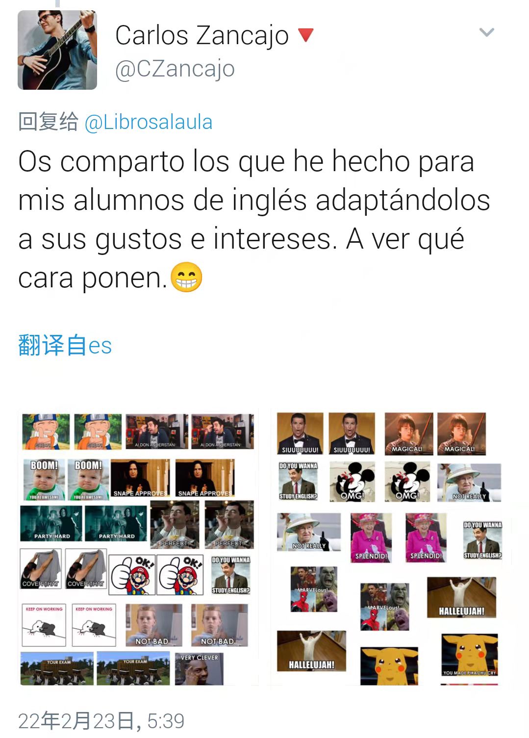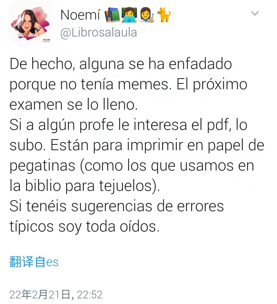Noemí的表情包在课堂和推特上都大获成功,于是她分享了手中的所有贴纸,并请其他“刷推的老师”为她提供制作新的表情包的创意:“有的学生因为卷子上没有表情包而生气,那么在下次考试中我会为他们贴满表情包。如果有老师对表情包的PDF感兴趣,我会上传。这些表情包要印在贴纸上(就像我们图书馆给书贴的标签那样)。如果你们有任何关于一些典型的错误的建议,我都会洗耳恭听。”