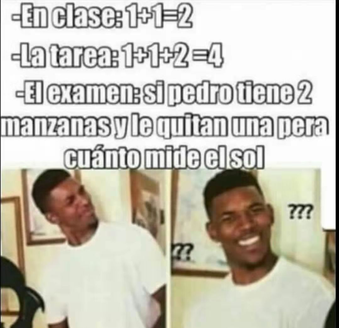 平时和考试的差距:“上课:1+1=2;作业:1+1+2-4;考试:如果佩德罗有2个苹果又扔了一个梨,那么太阳的直径有多大?”