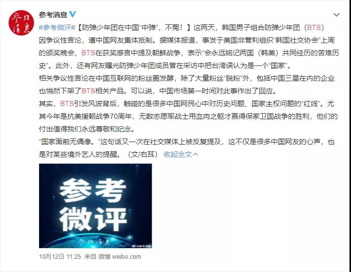 最近防弹少年团因关于朝鲜战争的不当发言而引发争议,一度登上热搜,引发国内粉丝抵制。