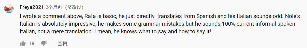 拉法的意大利语只是基础水平,他不过是把西班牙语直接翻成了意大利语,所以他的意大利语听起来非常奇怪。德约的意大利语听起来绝对是令人印象深刻的。他虽然会犯一些语法错误,但他听上去绝对是当前的通俗意大利语,而不仅仅是翻译。我的意思是,他(德约)知道该说什么,以及怎么表达出来!
