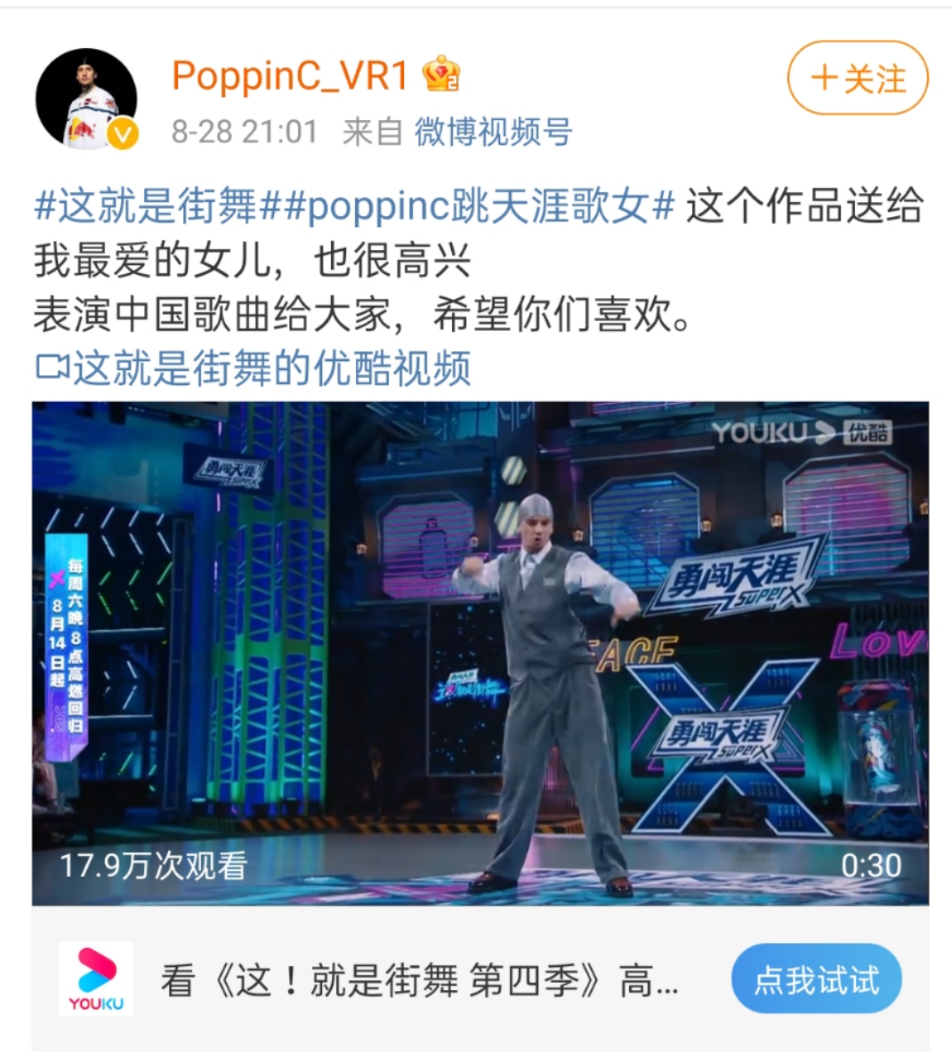 说了这么多,不如让我们在文章的最后一起来看一段Poppin'C拿着帽子freestyle的舞蹈视频,共同欣赏一下他的百般“舞”艺,然后心满意足地结束这篇文章吧!