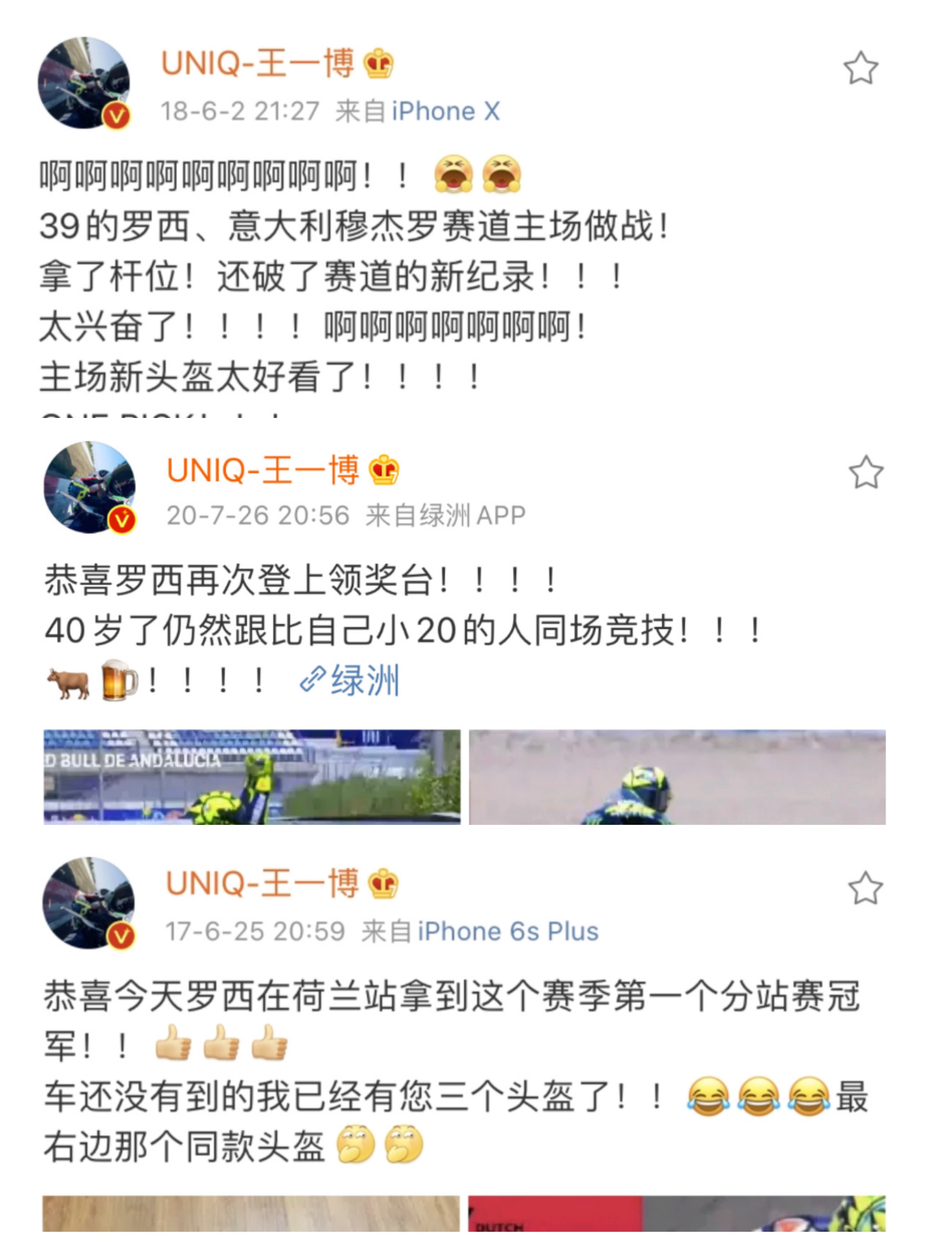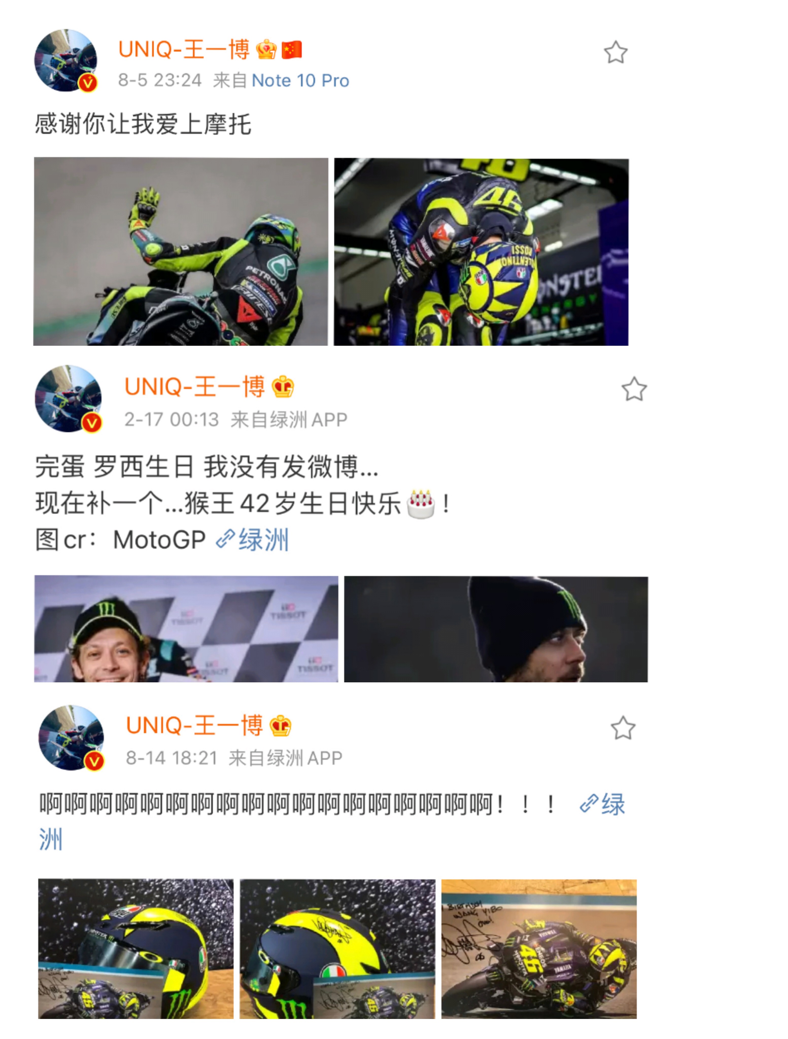 罗西在中国有很多车迷,其中艺人王一博对罗西的爱更是非粉皆知的程度,宛如是拖拉机上山——轰轰烈烈。他把罗西当作自己摩托车赛车路上的引路人,不仅多次在个人SNS上表白罗西、在之声送上生日祝福,还收集了多个罗西联名的46号头盔,并佩戴着其中一个参加了比赛。