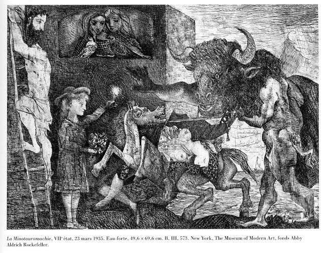 《牛头怪战役》是毕加索在巴黎创作的49,8x69,9 英寸的蚀刻版画和雕刻版画,现位于纽约现代艺术博物馆。