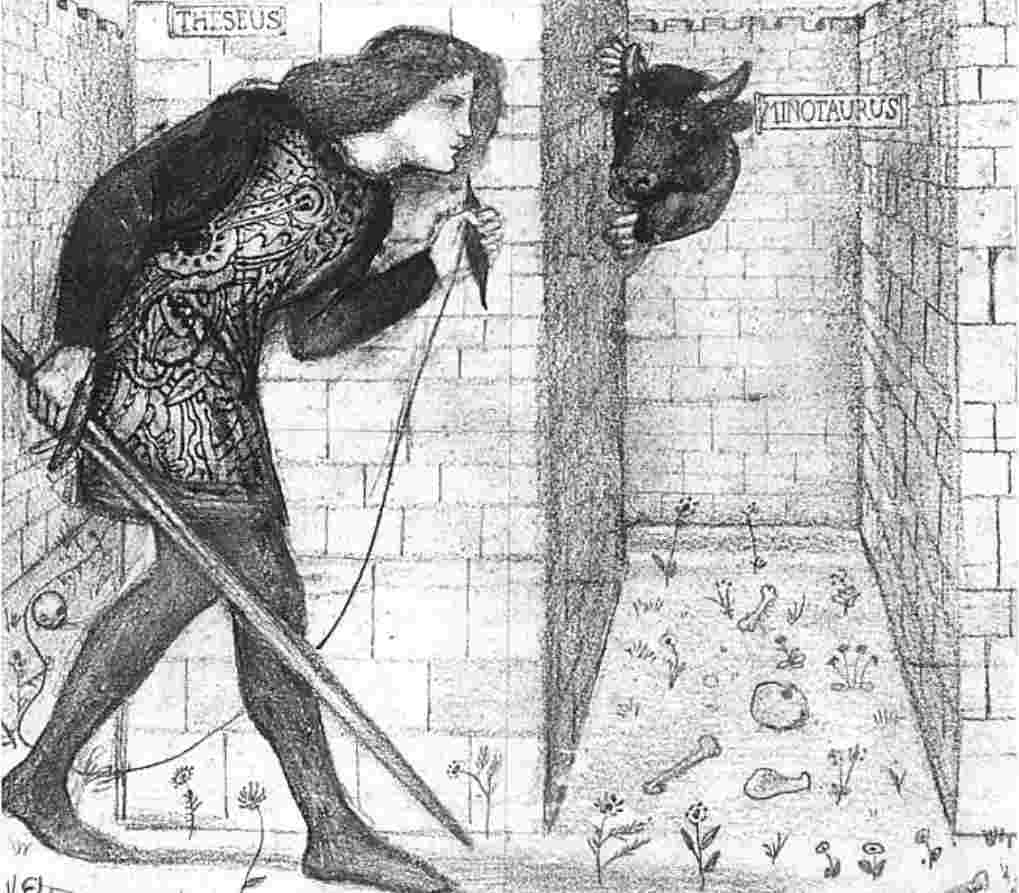 忒修斯是雅典娜国王埃勾斯的儿子,爱上米诺斯和帕西淮的女儿阿里安娜,他确信自己能击败弥诺陶洛斯,于是便请愿成为祭献的孩子中的一员。阿里安娜在忒修斯进入迷宫之前,给了男孩一根线球上的线,用以在迷宫内展开以免找不到出口。