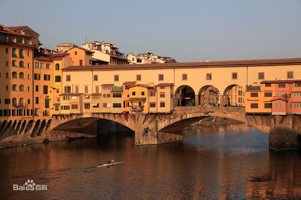 老桥是佛罗伦萨城最古老的桥梁。今天人们看到的这座老桥于1345年重建,之前的桥梁被洪水摧毁之后,乔托的弟子塔德奥·加迪主持重建了老桥。老桥没有像当时的桥梁一样有五个拱形桥洞,而是创新性地采用了三个大跨度圆弧拱形桥洞设计。这是欧洲第一座大跨度圆弧拱桥,为河水提供了更多流动空间,在洪水发生时更容易让各类杂物碎屑漂到下游。
