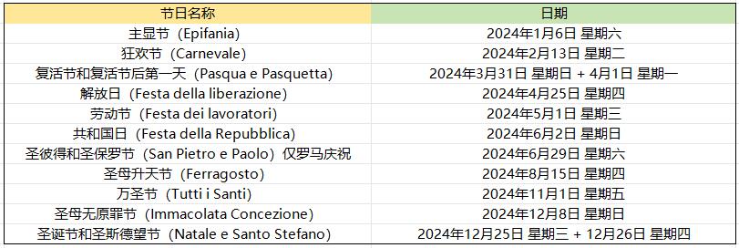 我们常常羡慕意大利朋友的假期多,打工人年假厚厚一沓,那他们2024年究竟有多少法定节假日呢?如果poonti发挥得好,会不会有半年时间都在放假?快一起来看看吧,在意大利的留学党们也快mark住哦,放假事大!