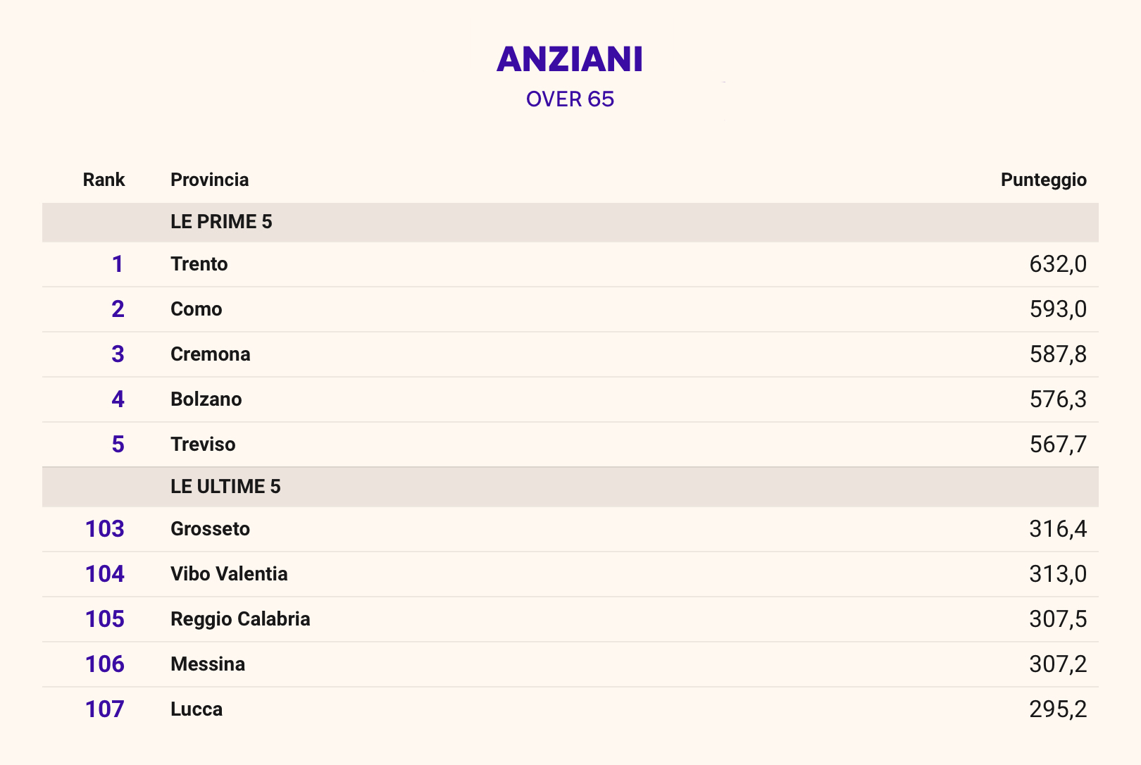 Trento mantiene salda la leadership per qualità della vita degli anziani. Che vede una forte presenza delle province del Nord in testa alla classifica, con la prevalenza indiscussa di tre regioni: Trentino Alto Adige, Lombardia e Veneto.