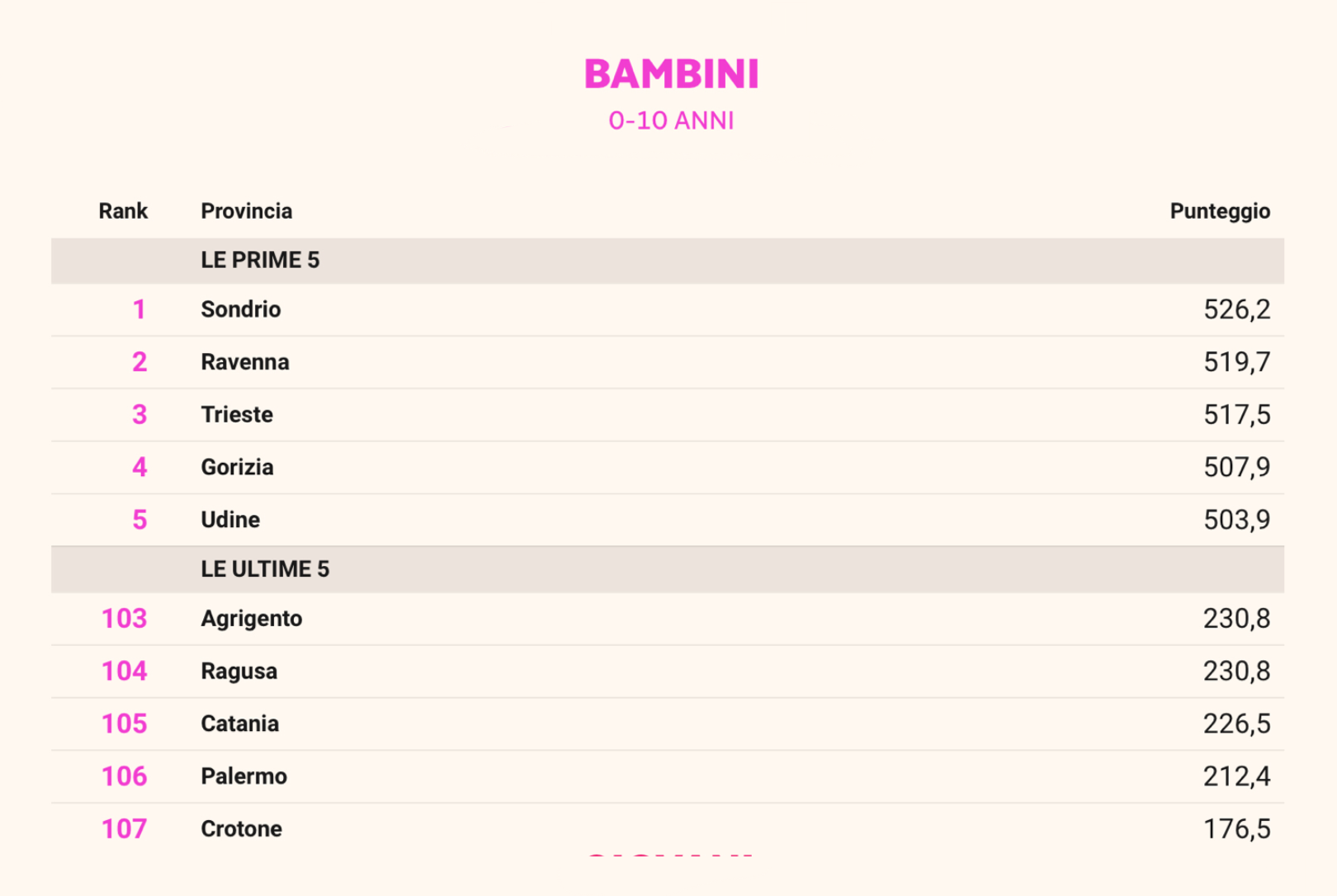L'indice della Qualità della vita dei bambini premia Sondrio che, rispetto all'edizione 2022, è protagonista di un balzo significativo verso l'alto (i bruschi cambiamenti di posizionamento possono essere imputati all'inserimento di nuovi indicatori, nda) complici posizionamenti alti negli indicatori che fotografano la competenza numerica e alfabetica non adeguata - che in Valtellina è ridotta - e nell'indice Sport e bambini. Sul podio anche Ravenna e Trieste, tallonate da Gorizia.