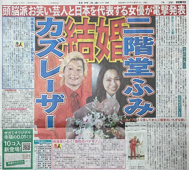 カズレーザーの公式Xに連名の文書が掲載され「平素より格別のご高配を賜り熱く御礼申し上げます。私カズレーザーと二階堂ふみは、このたび入籍いたしましたことをここにご報告させていただきます」と発表した。
