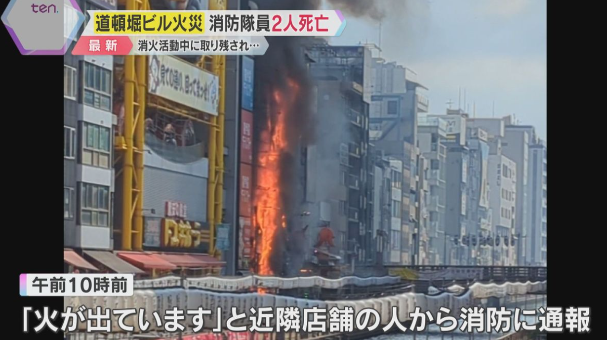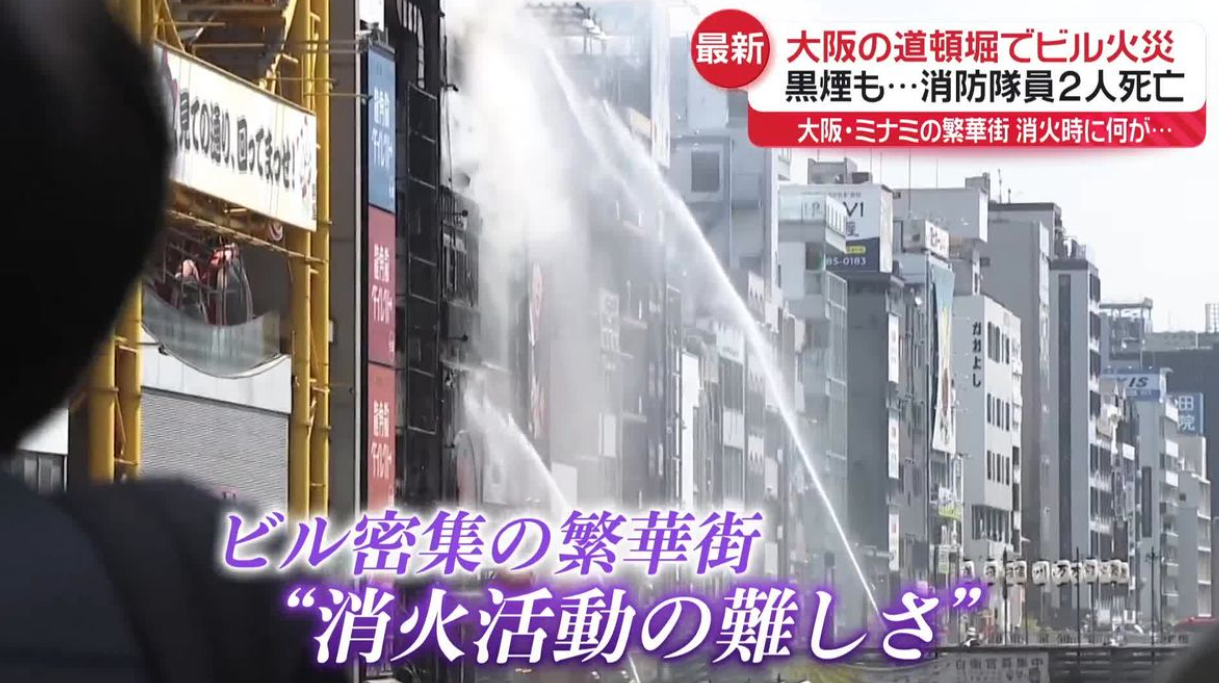 大阪府警南署によると、燃えたのは道頓堀川の遊歩道沿いにある5階建てと7階建てのビル。5階建ての方には24時間営業の焼肉店が入り、7階建てには人気ラーメン店「一蘭」などが出店している。ビルの数メートル西側には観光スポットにもなっている大型ディスカウントストア「ドン・キホーテ道頓堀店」がある。