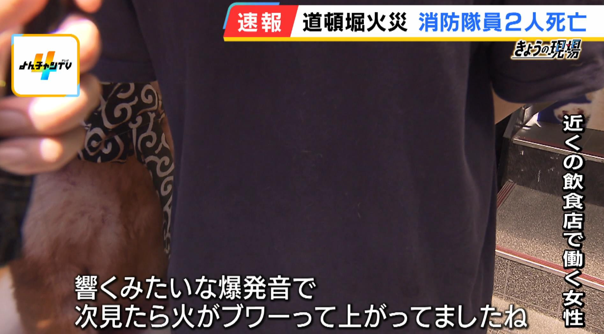 川の対岸にある飲食店の男性従業員(53)によると、発生当初、現場ビルに近付こうとする観光客らもいたが、爆発音が響くと逃げるようにして遠ざかった。男性従業員は二次被害を懸念して、硬い表情で消火活動を見守っていた。
