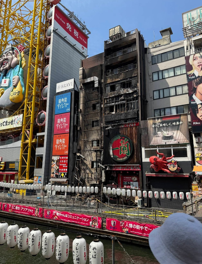 据大阪府警南署通报,起火的是道顿堀川步行街中的两栋建筑,分别有5层和7层。5层建筑中有一家24小时营业的烤肉店,7层建筑中则有人气拉面店“一兰”等商铺。大楼西侧几米处则是人气打卡点,大型折扣店“唐吉诃德道顿堀店”。