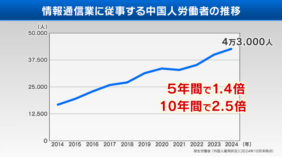 厚生労働省の統計によると、情報通信業で働く中国人労働者の数は、昨年10月末時点で4万3000人に達しました。10年前と比べると2.5倍になっています。また、中国人労働者全体に占める情報通信業の従事者の割合も、2024年には1割を超えました。これは、10年前と比べてほぼ倍増したことになります。