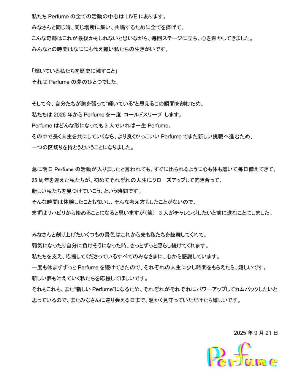 共同走过了25年的三人决定暂时停下脚步。あ~ちゃん(西胁绫香,36岁)、かしゆか(樫野有香,36)、のっち(大本彩乃,37)三人在官网中向大家报告:“为了定格我们心中‘最闪耀’的瞬间,决定从2026年起,Perfume暂时进入冷冻休眠期”。接着她们说明了原因:“只要三个人在一起,无论是什么形式,Perfume就还是Perfume。我们认为,要想共同度过漫长人生,以更好更完美的Perfume迎接新的挑战,需要停下来设立一个休憩点”。