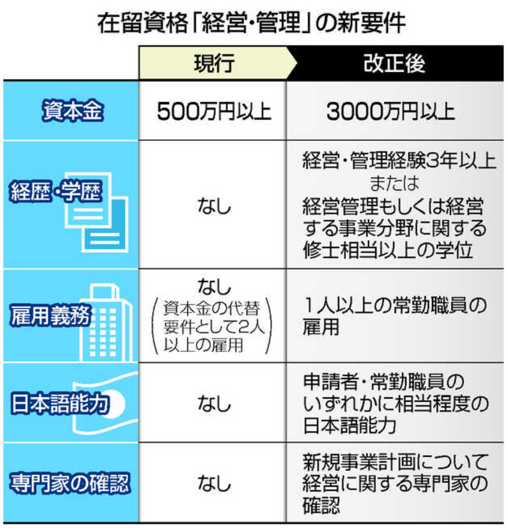 改正省令では、これまでの要件の資本金・出資総額500万円以上を3000万円以上に引き上げた。日本語能力の要件も新たに加え、本人もしくは会社の常勤職員に対し、国際基準で中上級者にあたる「B2」以上の能力を求める。常勤職員が日本人でない場合、ビジネス日本語能力テストで400点以上の点数などが必要となる。
