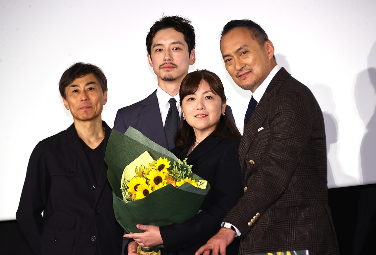 この日は坂口のほか、共演者の渡辺謙、メガホンを取った熊澤尚人監督、さらにサプライズで原作者の柚月裕子も登壇。タイトルにもなっている向日葵の花束を3人に贈呈した柚月は、「どうしても一言言いたかった。“監督ひどい!”」と完成した映画を見ての驚きの感想を語る。