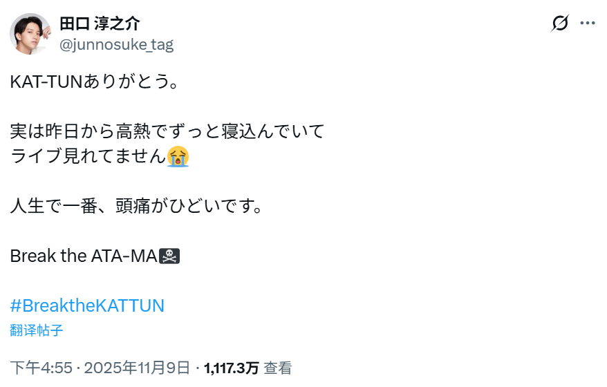 田口开篇写道“谢谢KAT-TUN”,并说明“其实从昨天起就因高烧一直卧床休息,没能看成演唱会。”推文最后还加上了演唱会标题的标签"Break the KAT-TUN"。