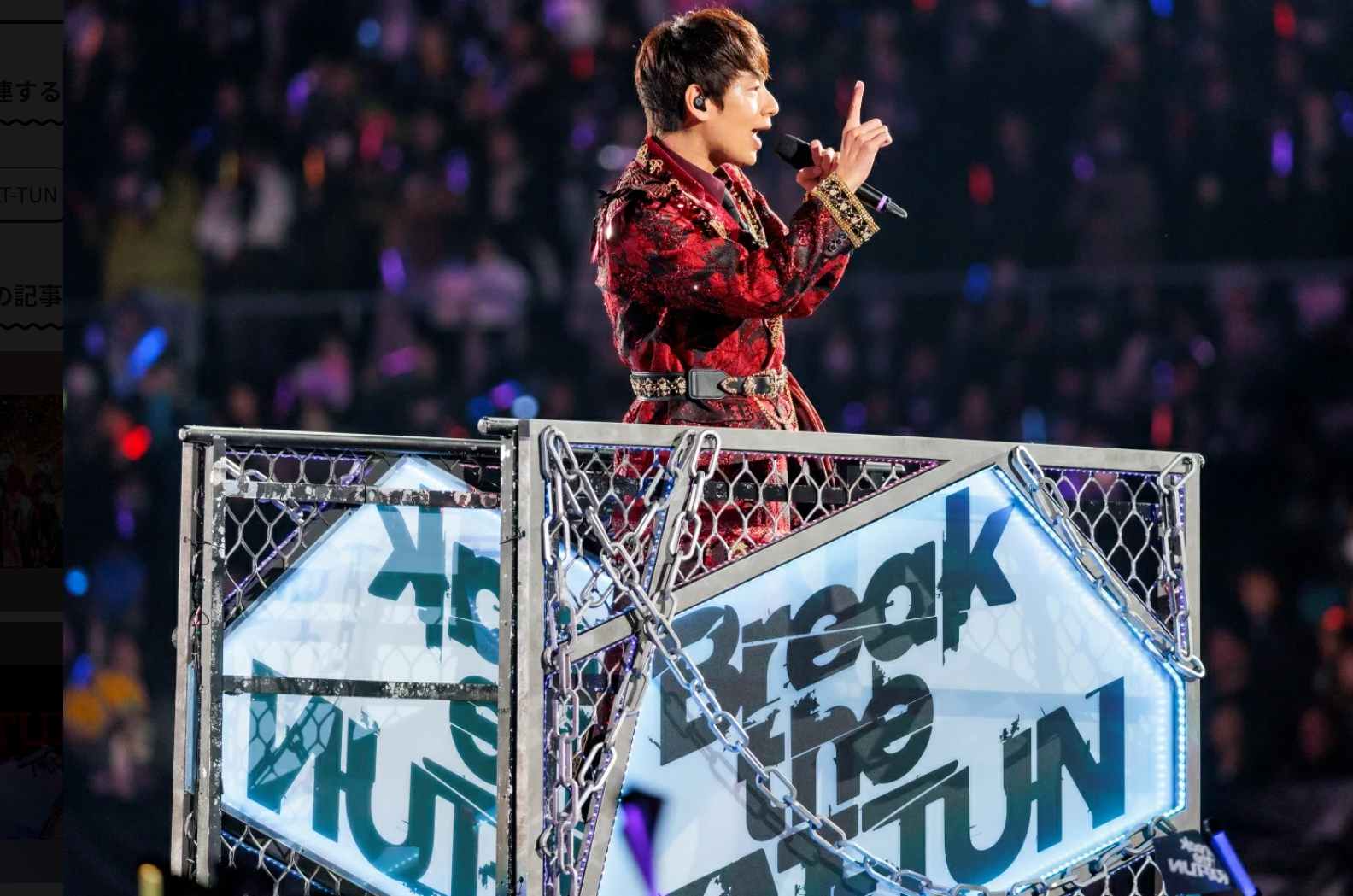于今年3月31日解散的三人组合KAT-TUN(龟梨和也、上田龙也、中丸雄一)本月8日在千叶海滨幕张的ZOZO海洋球场举办了演唱会“Break the KAT-TUN”。这场解散约7个月后举行的特殊演唱会吸引了3万名粉丝。整场演唱会表演了51首歌曲,时长约3个小时。