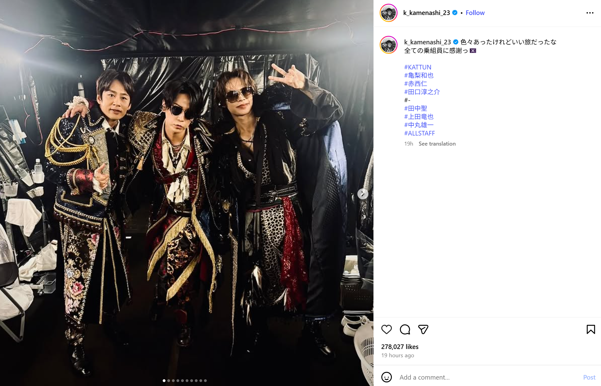 亀梨は「色々あったけれどいい旅だったな 全ての乗組員に感謝っ」「Thank you」とつづり、メンバーの上田竜也、中丸雄一らとのショットも投稿していた。写真は3ショットだが、ハッシュタグでは「#赤西仁」「#田口淳之介」「#田中聖」と、デビュー当初のオリジナルメンバーの名前も添えている。