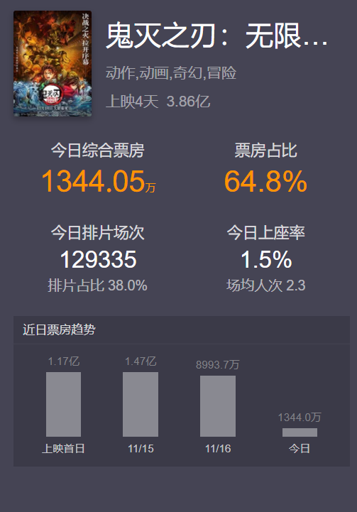 这是《鬼灭之刃》首次在中国大陆电影院上映。该片在中国的上映期限截至12月31日,社媒上不少“鬼灭”粉丝纷纷呼吁延长放映期限。