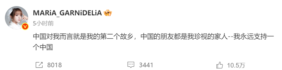 今天11月18日,美依礼芽发布微博写道:“中国对我而言就是我的第二个故乡,中国的朋友都是我珍视的家人——我永远支持一个中国。”在如今中日关系紧张的时期,美依礼芽却选择明确表达立场,引发网友热议。