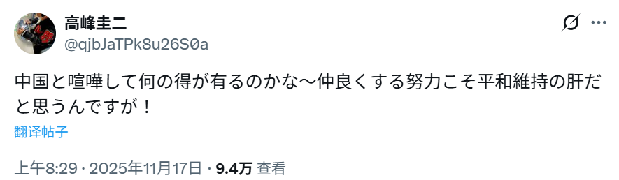 曾在《艾斯奥特曼》中饰演主人公北斗星司的日本演员高峰圭二17日更新了自己的X,针对日本首相高市早苗涉台海局势的相关言论质问道:“与中国起争执有什么好处呢~我认为努力建立友好关系才是维持和平的关键”。虽然是简单的一句话,却瞬间击中了无数人的心。