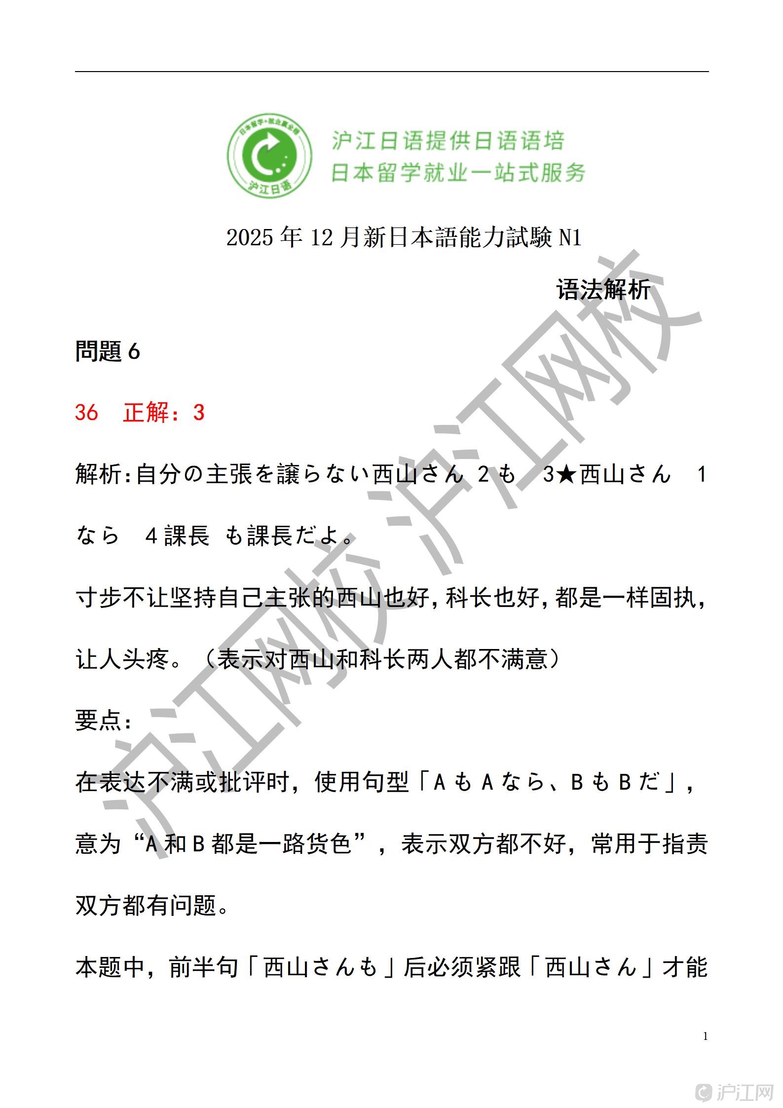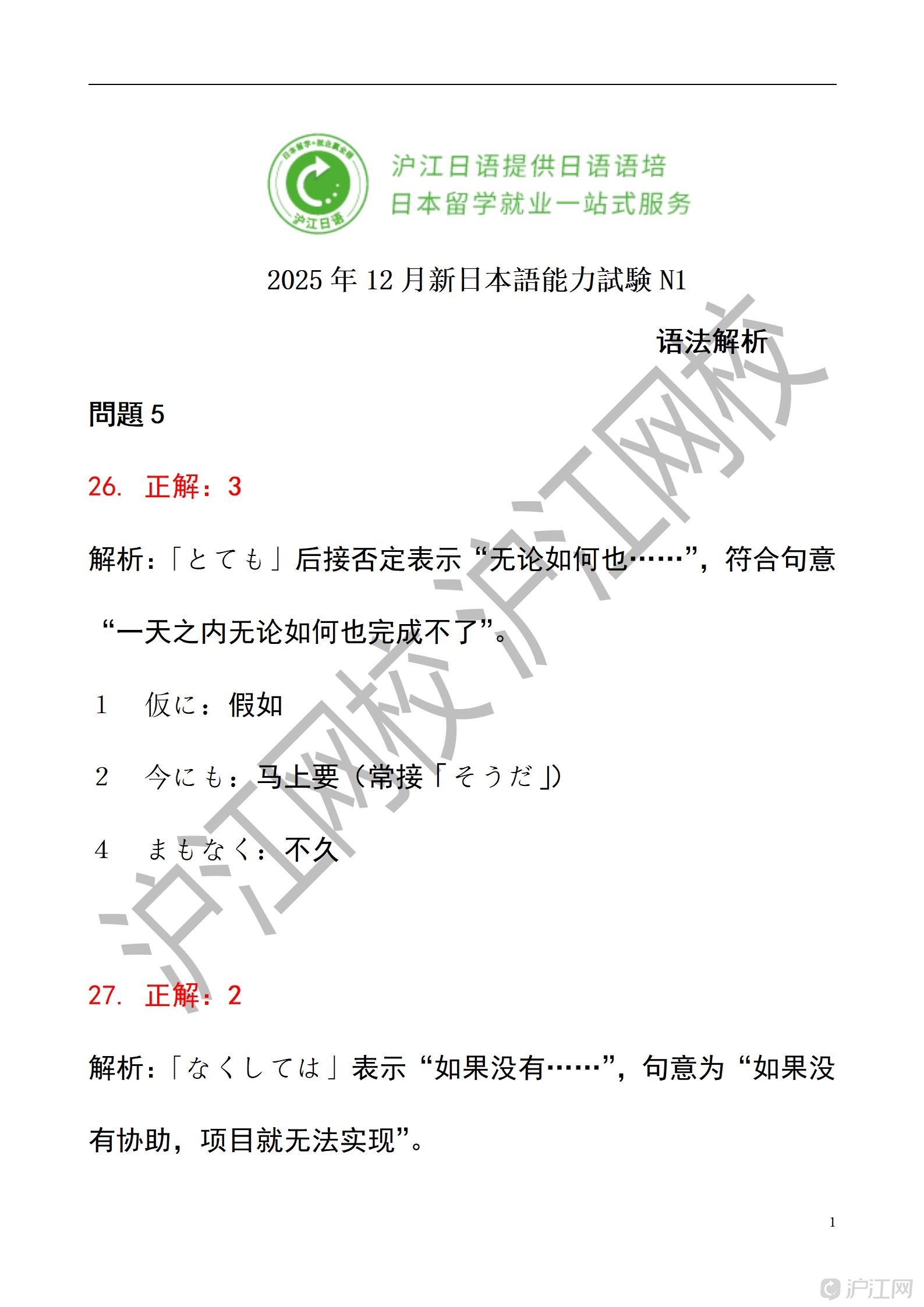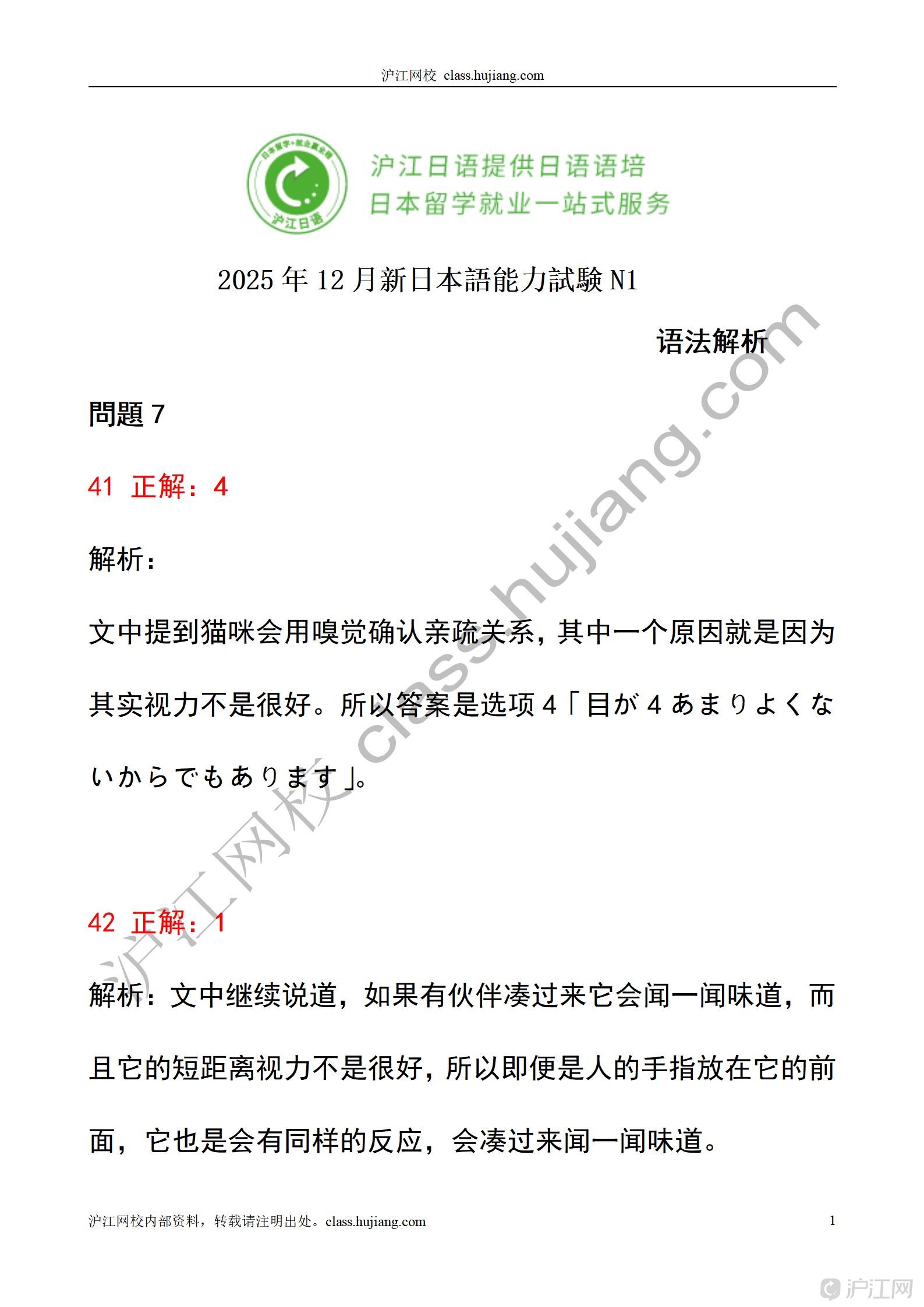2025年12月日语能力考N1语法答案解析(沪江网校)