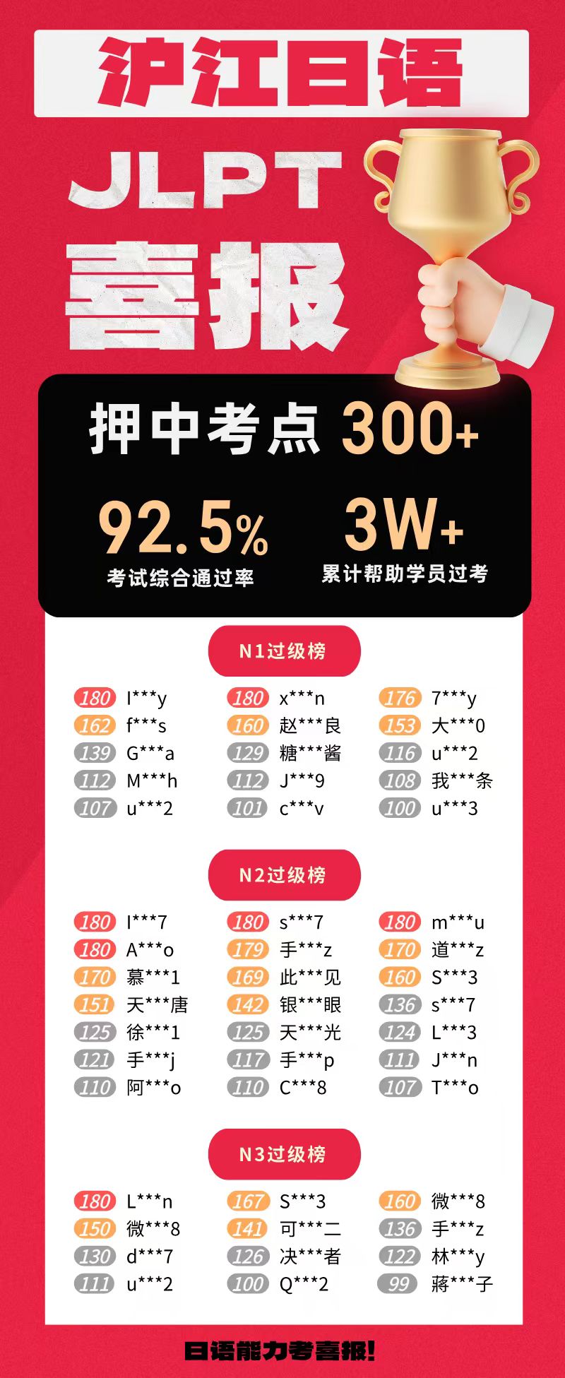 沪江日语深耕日语教育行业21年,资深教研团队拥有丰富的日语教学经验,对能力考深入研究,熟悉考试要点、难点,21年教育生涯中,共培养3万考生通过能力考,其中更有3000+名满分学员!年年押中大量考点,此次2025年7月考试押题量更是创新高,共押中363个考点!