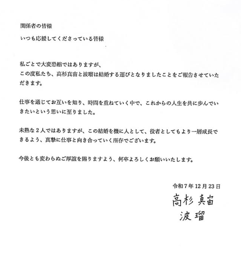 sponichi22日采访获悉,女演员波瑠(34岁)与演员高杉真宙(29岁)已经结婚,二人已于本月上旬在都内区役所提交结婚申请,并且举办了仅邀请亲属参加的婚礼。二人交往约两年。