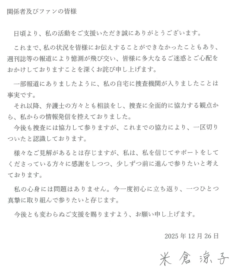 12月26日,女演员米仓凉子更新了官方网站。首次提及自己的药物争议,并报告了现状。