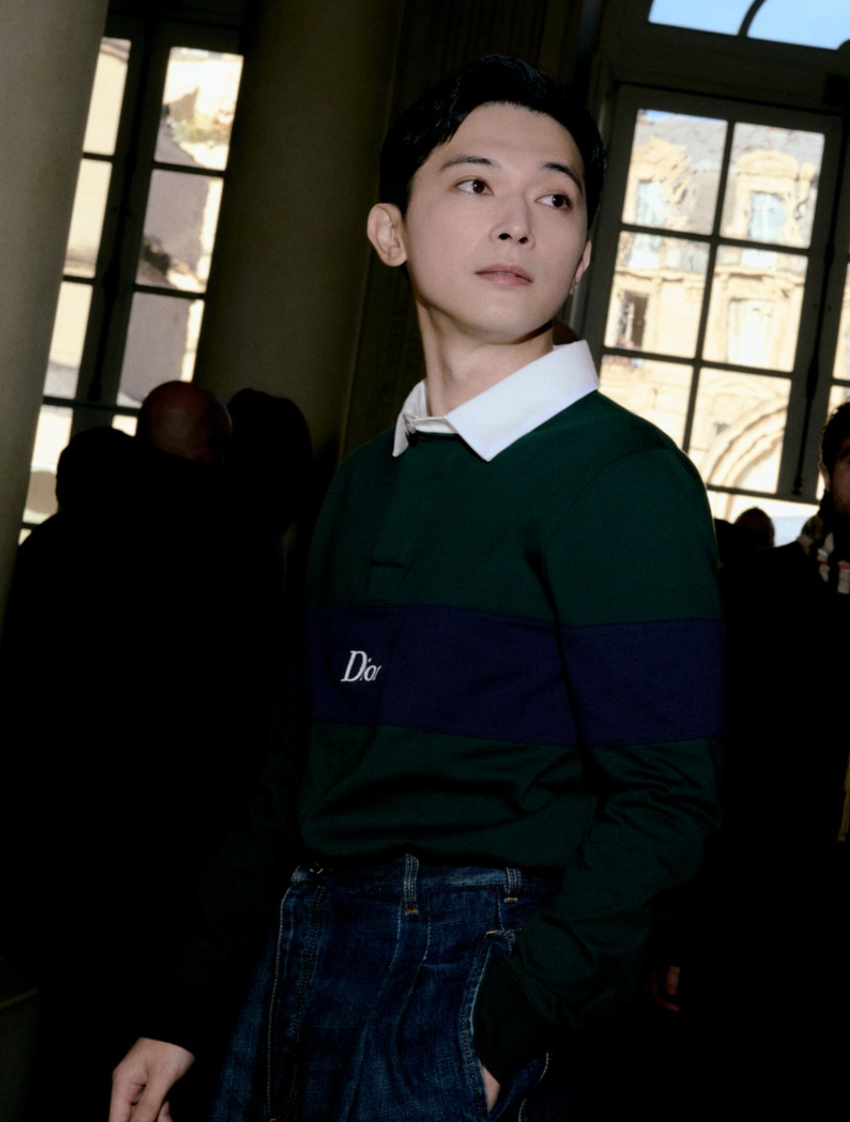 “迪奥美妆大使”吉泽亮,以一件绿海军蓝拼色针织Polo衫,搭配深蓝色“Caprice”牛仔裤亮相。