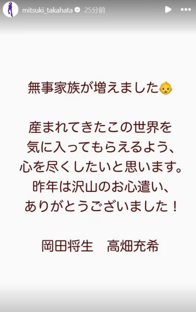 高畑と岡田は夫婦連名の文書を掲載し、「無事家族が増えました」と赤ちゃんの絵文字と添えて報告。「生まれてきたこの世界を気に入ってもらえるよう、心を尽くしたいと思います! 昨年はたくさんのお心遣い、ありがとうございました!」とつづった。