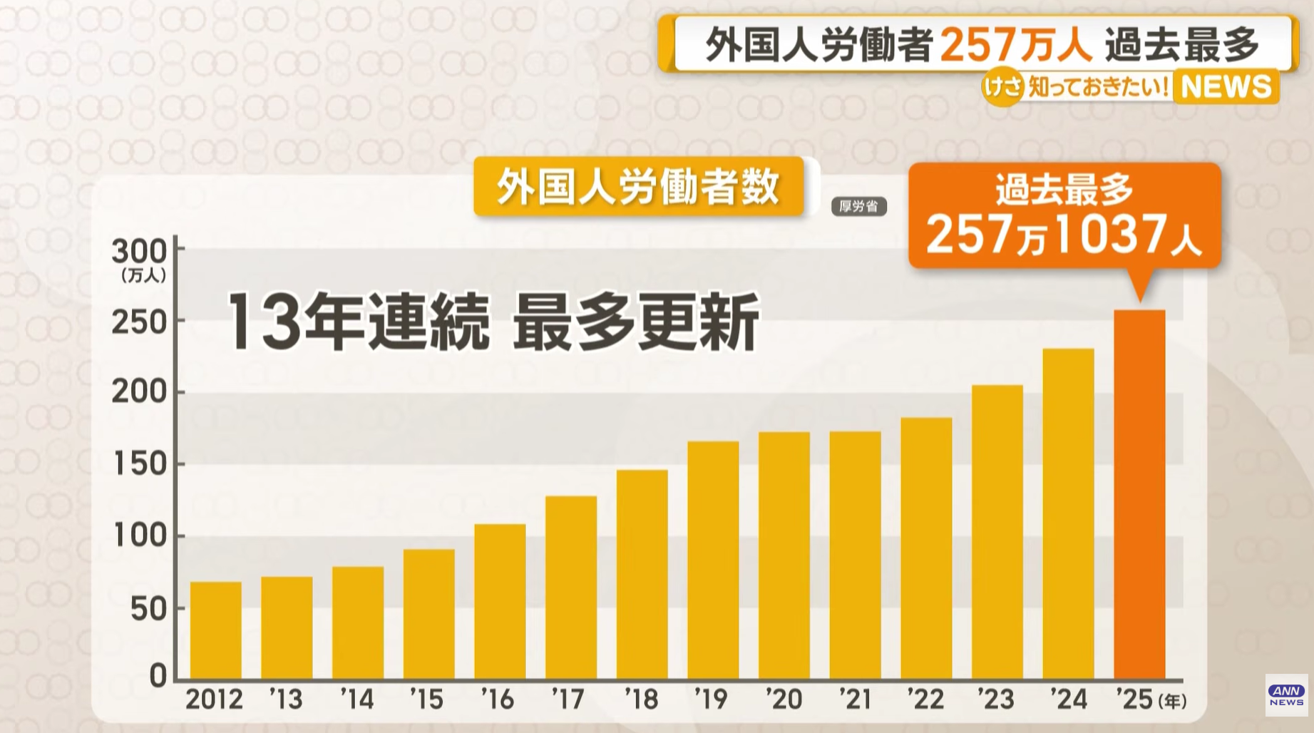 円安が続くなかでも日本にくる労働者数は伸びており、厚労省外国人雇用対策課は「治安の良さで日本に来たいという人は多い」と説明。「実態を適切に把握しつつ、ハローワークによる事業指導なども通じて就労環境の整備にしっかりと取り組んでまいりたい」としている。