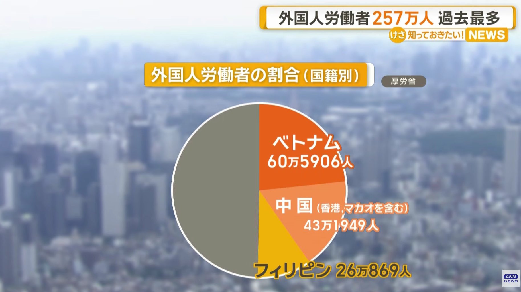 発表によると、国籍別ではベトナムが60万5906人と最多で、全体の23・6%を占めた。次いで、中国が43万1949人(16・8%)、フィリピンが26万869人(10・1%)などと続いた。