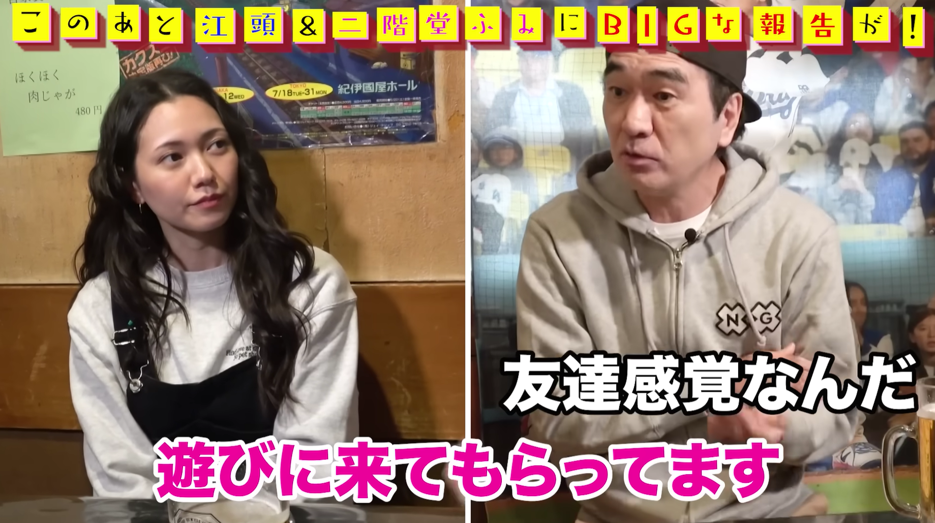 江頭さんから「どうやって付き合ってるの?行ったり来たり?」と聞かれると、二階堂さんは「遊びに来てもらってます」と現在の生活スタイルを笑顔で回答。江頭さんが「友達感覚なんだ」と驚きを見せると、二階堂さんも「そうですね」と頷き、良好な関係性をうかがわせました。
